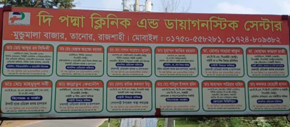 রাজশাহীর তানোরের মুন্ডুমালা পৌর সদরে বিএনপি নেতা মোজাম্মেল হকের মালিকাধীন ভবনে গড়ে উঠা কথিত দি পদ্মা ক্লিনিক এ্যান্ড ডায়াগনস্টিক সেন্টারে ভুল চিকিৎসায় নবজাতক মুত্যুর অভিযোগ পাওয়া গেছে।এ ঘটনায় ৭ অক্টোবর মঙ্গলবার নবজাতকের পিতা আব্দুর রাজ্জাক বাদি হয়ে তানোর থানায় লিখিত অভিযোগ করেছেন।এদিকে অভিযোগ তুলে নিয়ে মিমাংসার জন্য রাজ্জাককে নানাভাবে ভয়ভীতি ও হুমকি দেয়া হচ্ছে।